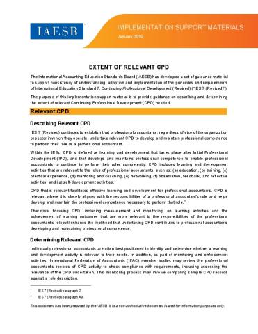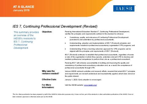 The revised International Education Standard (IES) 7, Continuing Professional Development, clarifies the principles and requirements for how professional accountancy organizations measure, monitor, and enforce their continuing professional development systems. It makes it clear that all professional accountants must develop and maintain professional competence to perform their role.