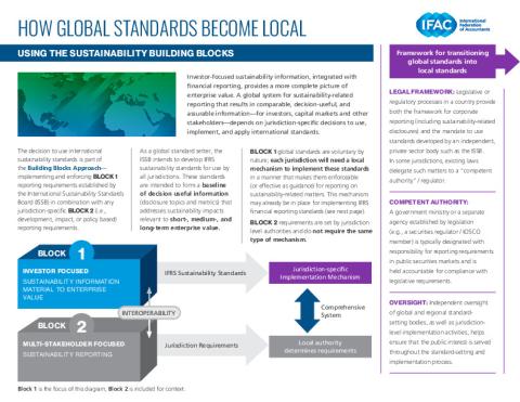 IFAC’s new framework for implementing global sustainability standards set by an International Sustainability Standards Board builds on the previously issued Building Blocks Approach. This framework examines how existing mechanisms already in place for adopting IFRS Standards used in financial reporting may be appropriate or adapted for sustainability-related reporting. Alternatively, a new mechanism may be required. IFAC urges its member organizations to engage now with local policy makers on what mechanisms (new or existing) can be used to transition forthcoming global standards into local standards—implemented and enforced in jurisdictions around the world.