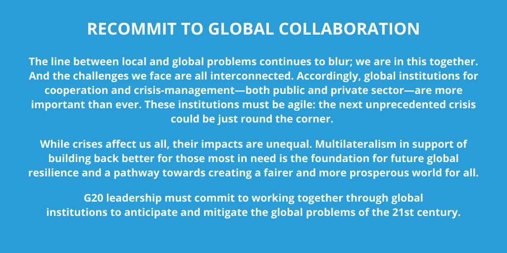 The challenges raised by COVID-19 are unprecedented in the modern era; so too have been the responses from G20 governments. The short-term focus on the pandemic has been rightfully all encompassing. At the same time, we must not allow the immediate needs of the recovery to derail progress on other urgent global priorities. We are at an inflection point: staying focused on the future while responding to COVID-19 is critical to strong, sustainable economies and realizing the opportunities of the 21st century for all.