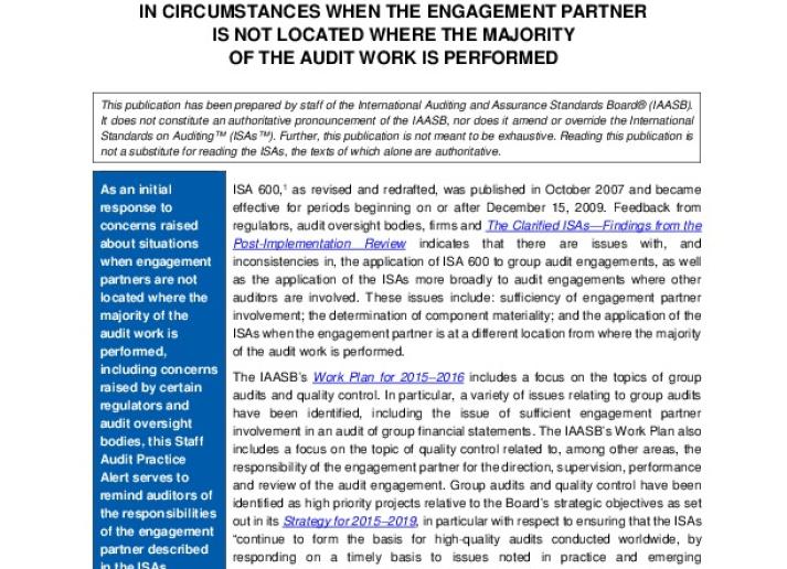 Staff Audit Practice Alert: Responsibilities of the Engagement Partner in Circumstances when the Engagement Partner Is Not Located Where the Majority of the Audit Work is Performed Audit & Assurance Aug 14, 2015 • International Auditing and As…
