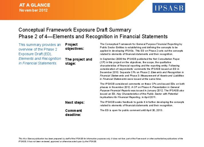 At a Glance: Conceptual Framework for General Purpose Financial Reporting by Public Sector Entities: Elements and Recognition in Financial Statements Public Sector International Standards November 7, 2012 • ipsasb.org
