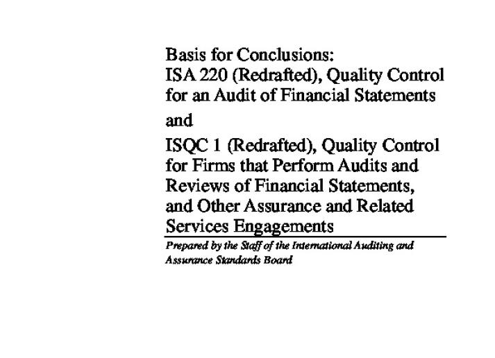 Basis for Conclusions: ISA 220, Quality Control for an Audit of Financial Statements and ISQC 1, Quality Control for Firms that Perform Audits and Reviews of Financial Statements, and Other Assurance and Related Services Engagements Audit & Assurance International Standards November 30, 2008 • iaasb.org