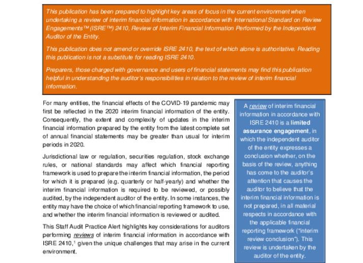 IAASB Staff Audit Practice Alert: Review Engagements on Interim Financial Information in the Current Evolving Evolving Environment due to COVID-19 Jul 2, 2020 • IAASB